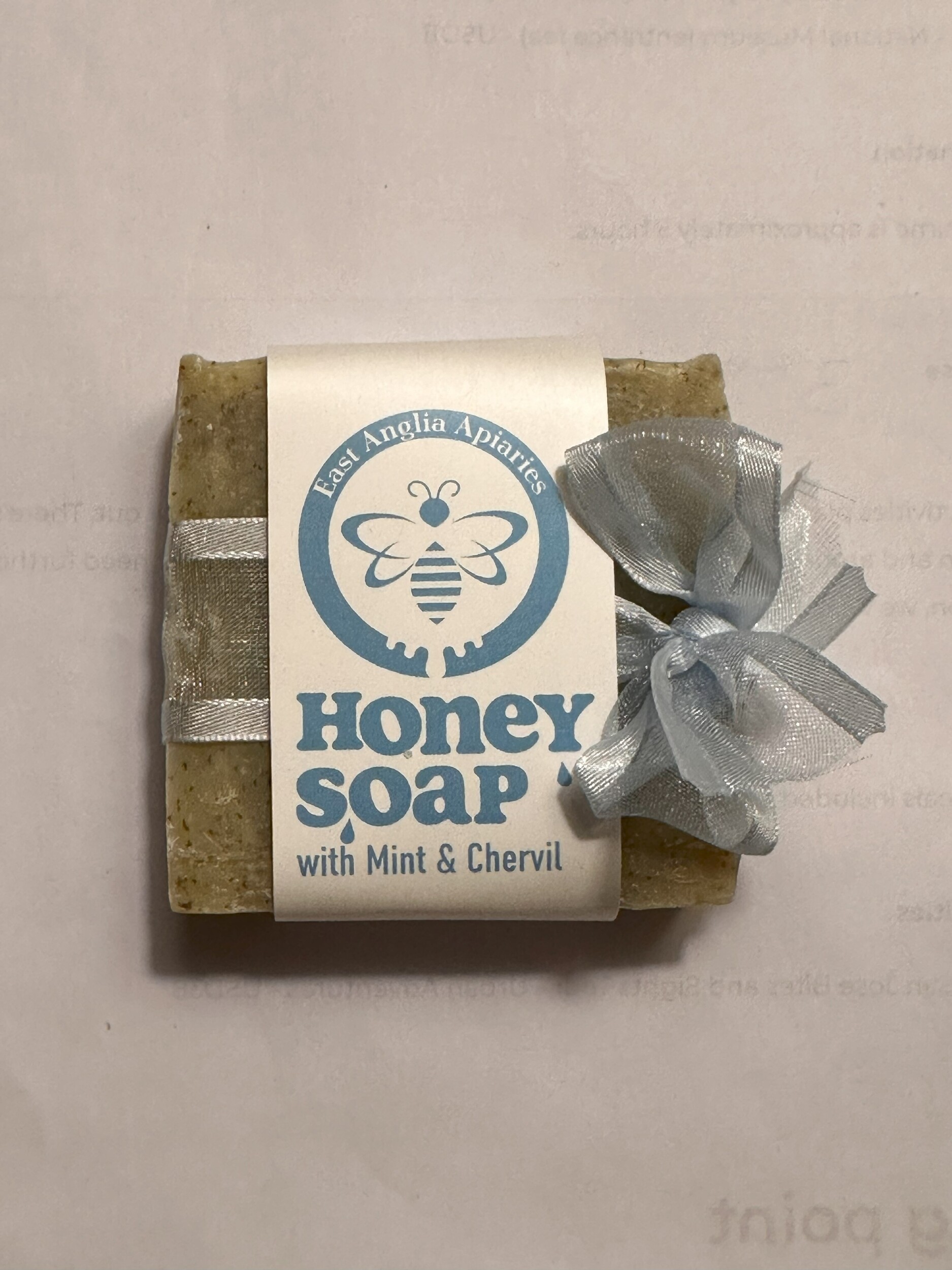 Lye Solution together with Coconut Oil, Olive Oil, Rapeseed Oil, Castor Seed Oil, Shea Butter, Beeswax, Turmeric, Honey, Peppermint and Spearmint Essential Oils and Dried Chervil. 90g.