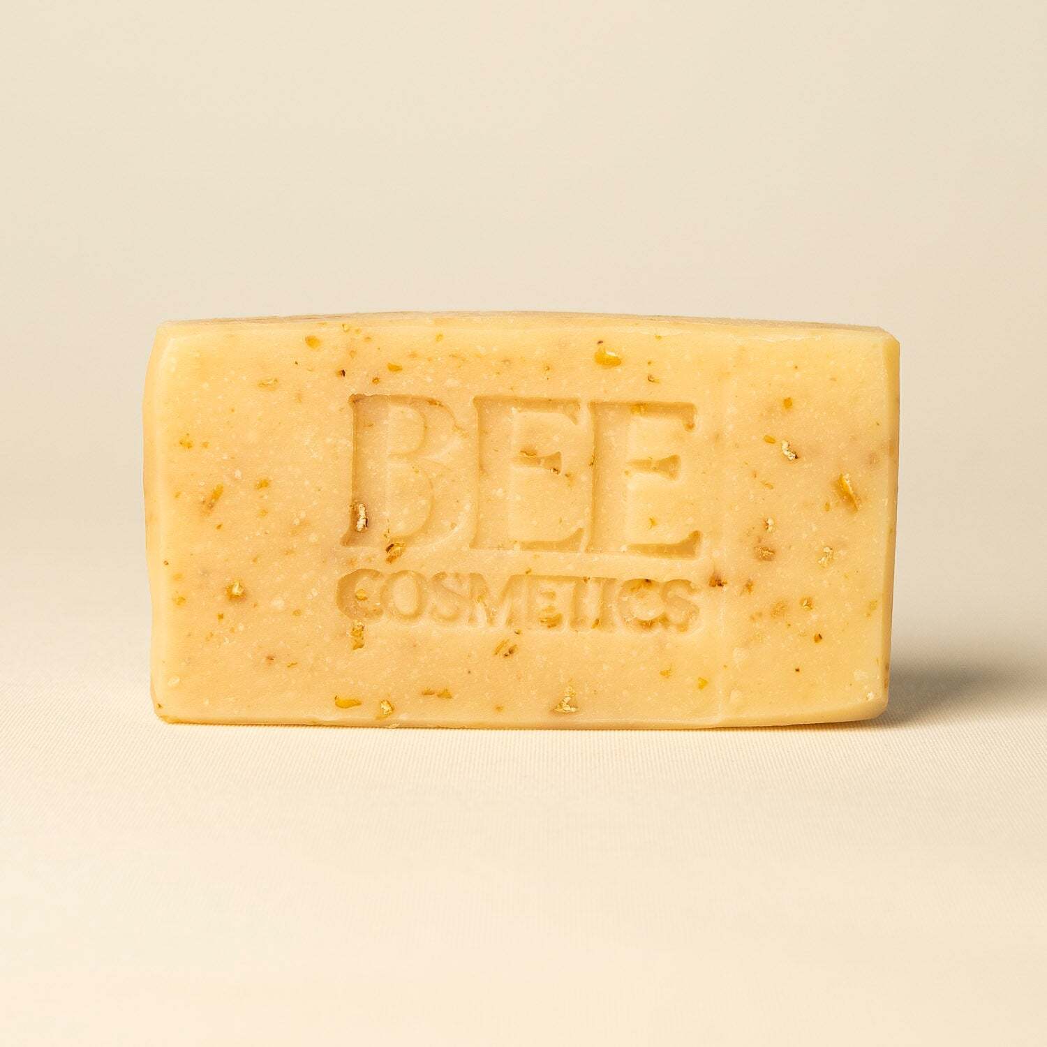 Bee Cosmetics soap, gently exfoliate and cleanse with soothing honey, oatmeal, and the uplifting scent of orange and clary sage.