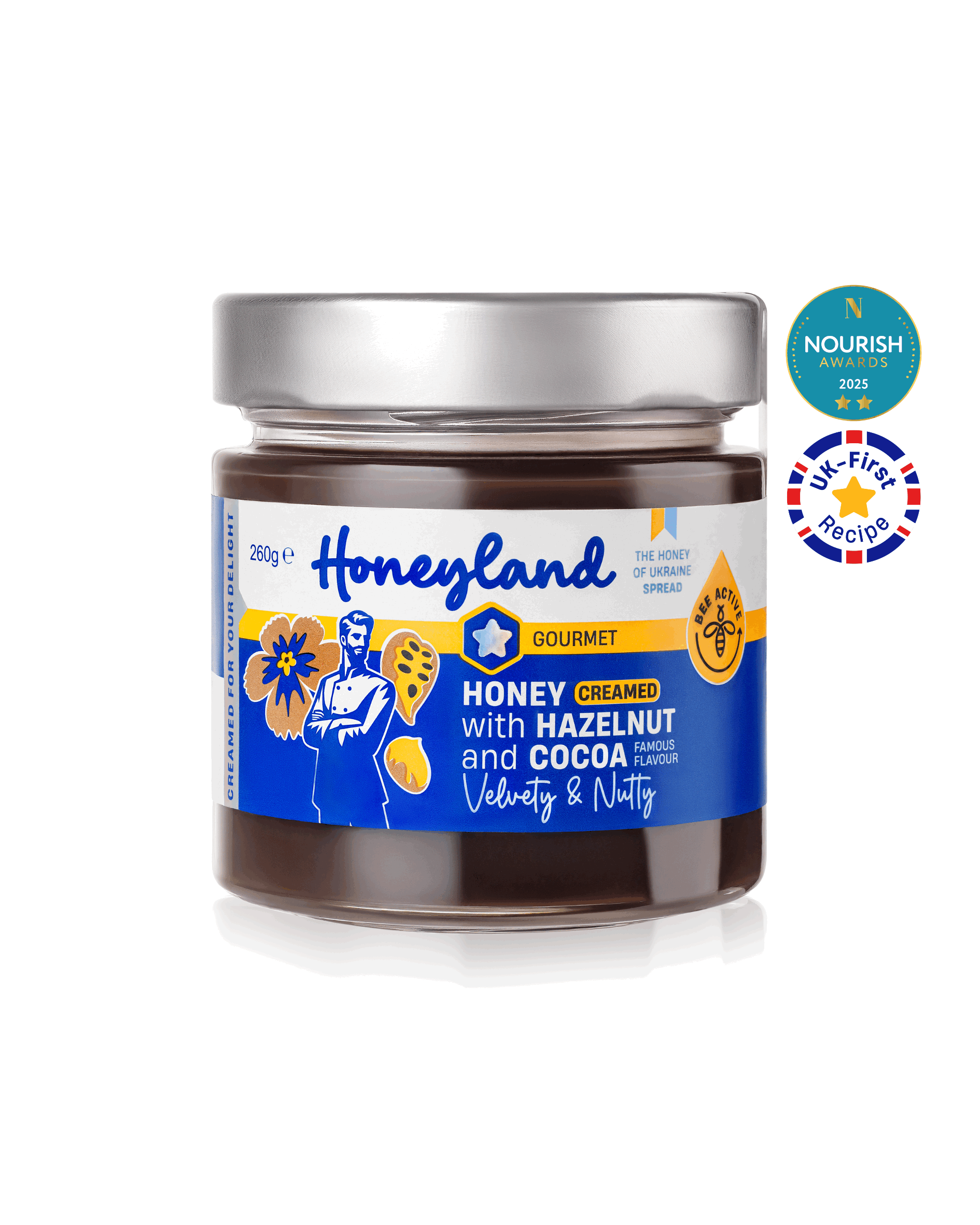 Indgredients: natural flower honey, hazelnut paste, cocoa powder. Traditionally harvested, cold extracted, minimally filtered, gently creamed, unpasteurised. Packed in a 260g glass recyclable glass jar. Contains hazelnuts.